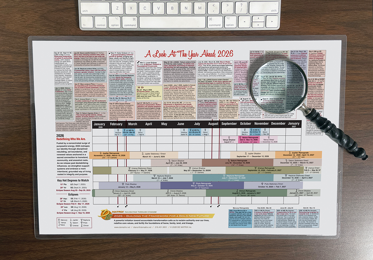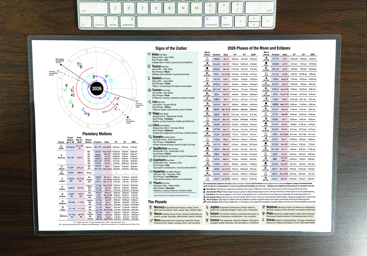 This laminated, 2-sided, 17″ x 11″ Desk Calendar provides a complete astrological overview of 2026 at a glance.